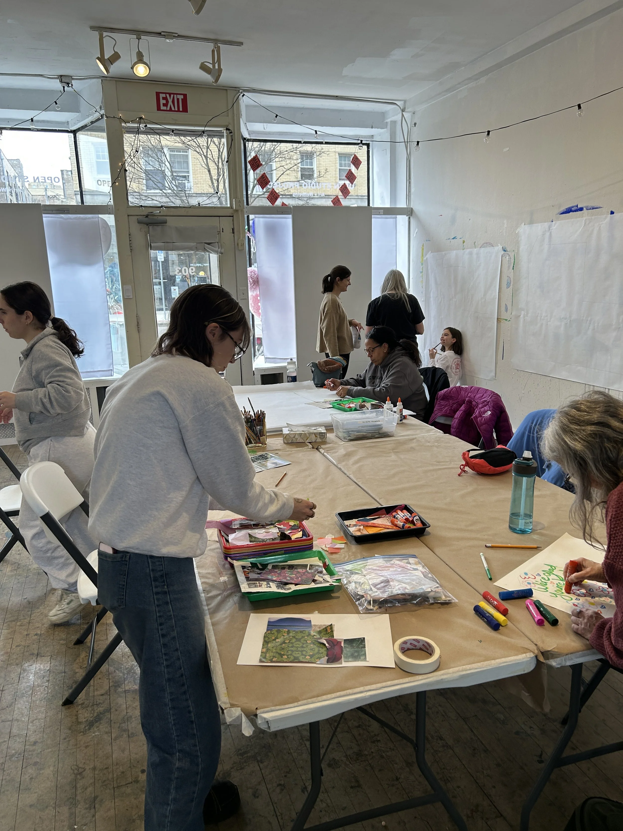 In February and March, we were thrilled to welcome members of our community – including Katherine Gotsick from the Main Dempster Mile, as well as mural artists Oscar Joyo, Xavier Wynn, and Edwige Massart – into the studio for an afternoon of art making and connection.