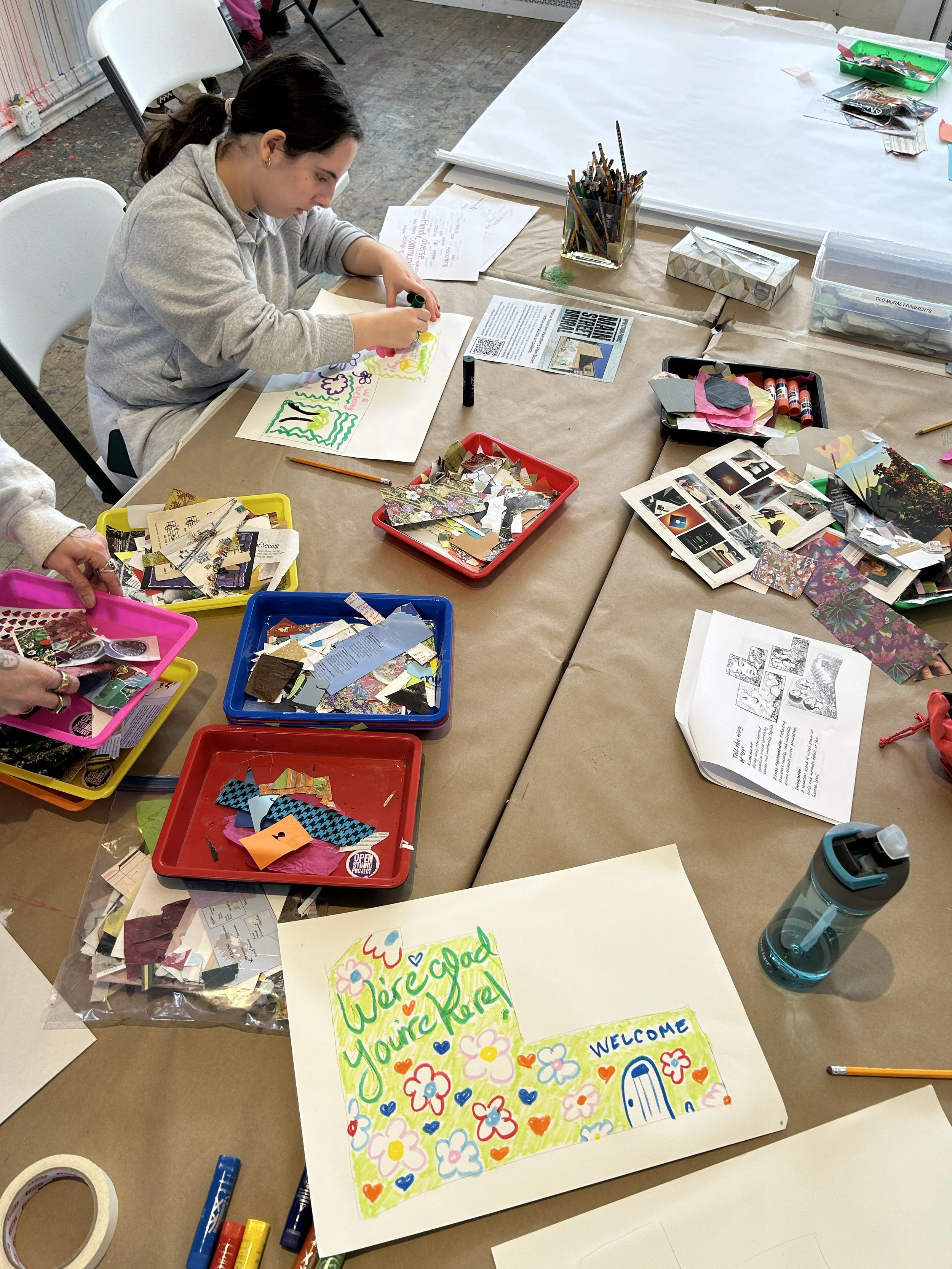 During the art-making portion of the workshop, we hung large sheets of paper on the wall with outlines of the mural, and invited people to fill them in with their artwork. Some workshop participants chose to draw, while others made mixed-media collages.